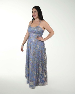 VESTIDO COCKTAIL LARGO, CON BRILLOS, DE FALDA SEMICIRCULAR, ESCOTE RECTO Y AMARRE CON JARETAS.