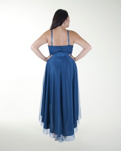 VESTIDO COCKTAIL LARGO, FALDA PLISADA EN DESNIVEL, TALLE CON DRAPEADO Y DE ESCOTE ESTILO CORAZON.