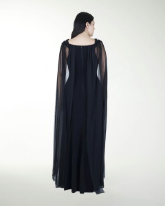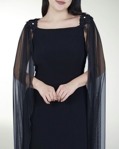 VESTIDO COCKTAIL LARGO, DE ESCOTE RECTO, MANGAS LARGAS EN GASA Y DETALLES DE FLOR EN EL HOMBRO.