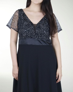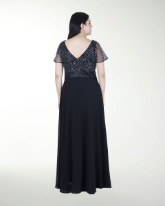 VESTIDO COCKTAIL LARGO, COMBINADO EN CHIFON, DE TALLE ESTAMPADO, ESCOTE EN V Y DE MANGAS CORTAS.