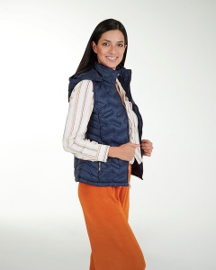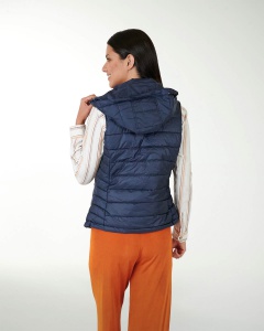 CHALECO CASUAL DE DAMA, CON CIERRE FRONTAL, CUELLO ALTO, CAPUCHA Y BOLSAS CON CIERRE.
