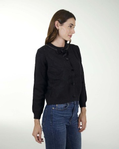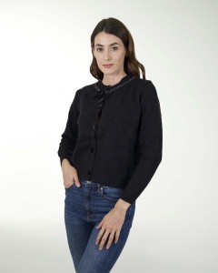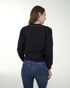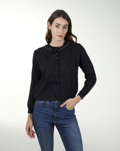 SUETER TEJIDO DE MANGAS LARGAS, DE FIGURA DE ROMBOS ABIERTO CON BOTONES Y DETALLE DE MOÃO.