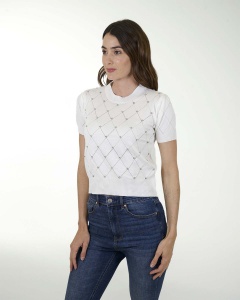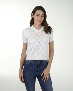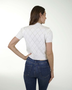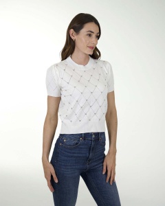 BLUSA TEJIDA DE FIGURA DE ROMBOS CON PERLAS, DE CUELLO ALTO, RESORTE EN LA CINTURA Y MANGAS CORTAS.