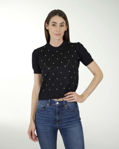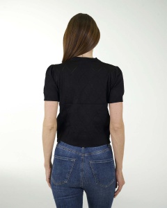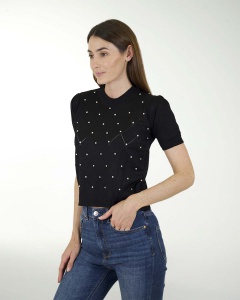 BLUSA TEJIDA DE FIGURA DE ROMBOS CON PERLAS, DE CUELLO ALTO, RESORTE EN LA CINTURA Y MANGAS CORTAS.