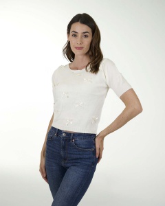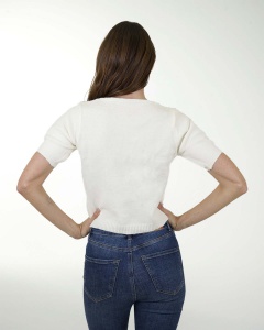 BLUSA TEJIDA CORTA, DE CUELLO REDONDO CON DETALLES DE MOÃO, RESORTE EN LA CINTURA Y MANGAS CORTAS.
