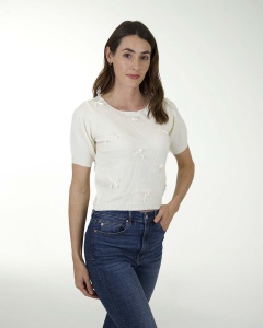 BLUSA TEJIDA CORTA, DE CUELLO REDONDO CON DETALLES DE MOÃO, RESORTE EN LA CINTURA Y MANGAS CORTAS.