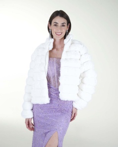 CHAMARRA CORTA DE PELO SINTETICO, DE CUELLO ALTO, MANGAS LARGAS Y CIERRE FRONTAL.