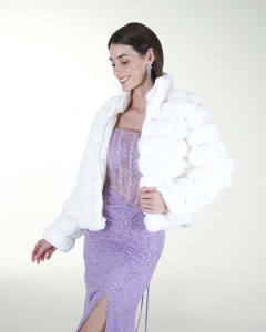 CHAMARRA CORTA DE PELO SINTETICO, DE CUELLO ALTO, MANGAS LARGAS Y CIERRE FRONTAL.