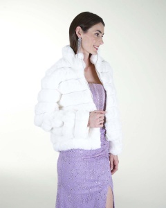CHAMARRA CORTA DE PELO SINTETICO, DE CUELLO ALTO, MANGAS LARGAS Y CIERRE FRONTAL.