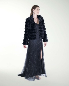 CHAMARRA CORTA DE PELO SINTETICO, DE CUELLO ALTO, MANGAS LARGAS Y CIERRE FRONTAL.