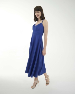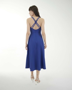 VESTIDO CASUAL, ESTILO MIDI EN TELA LISA, FALDA CIRCULAR, DE ESCOTE EN V Y TIRANTES CRUZADOS.