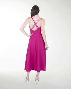 VESTIDO CASUAL, ESTILO MIDI EN TELA LISA, FALDA CIRCULAR, DE ESCOTE EN V Y TIRANTES CRUZADOS.