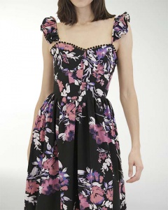 VESTIDO CASUAL, ESTILO MIDI EN TELA ESTAMPADA, FALDA CON ABERTURA, ESCOTE ESTILO CORAZON Y TIRANTES.