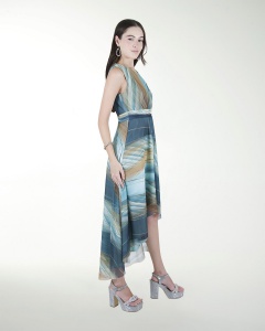 VESTIDO CASUAL, EN TELA ESTAMPADA DE FALDA ASIMETRICA, DE CUELLO REDONDO Y SIN MANGAS.