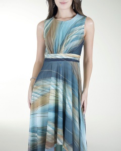 VESTIDO CASUAL, EN TELA ESTAMPADA DE FALDA ASIMETRICA, DE CUELLO REDONDO Y SIN MANGAS.