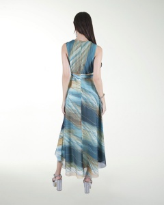 VESTIDO CASUAL, EN TELA ESTAMPADA DE FALDA ASIMETRICA, DE CUELLO REDONDO Y SIN MANGAS.