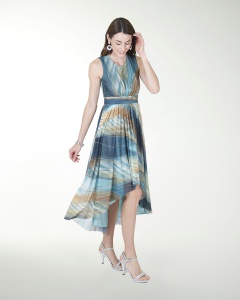 VESTIDO CASUAL, EN TELA ESTAMPADA DE FALDA ASIMETRICA, DE CUELLO REDONDO Y SIN MANGAS.