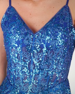 VESTIDO GRAN GALA, ESTILO ENTALLADO CON DESTELLOS EN BRILLO, ESCOTE TIPO V Y TIRANTES TIPO SPAGUETTI