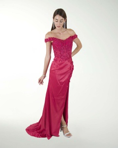 VESTIDO DE GRAN GALA, ESTILO ENTALLADO, FALDA CON ABERTURA, TALLE TIPO CORSET Y DE MANGAS CAIDAS.