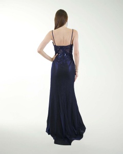 VESTIDO GRAN GALA, ESTILO ENTALLADO EN GLITTER, TALLE BORDADO CON TRANSPARENCIAS Y ABERTURA.